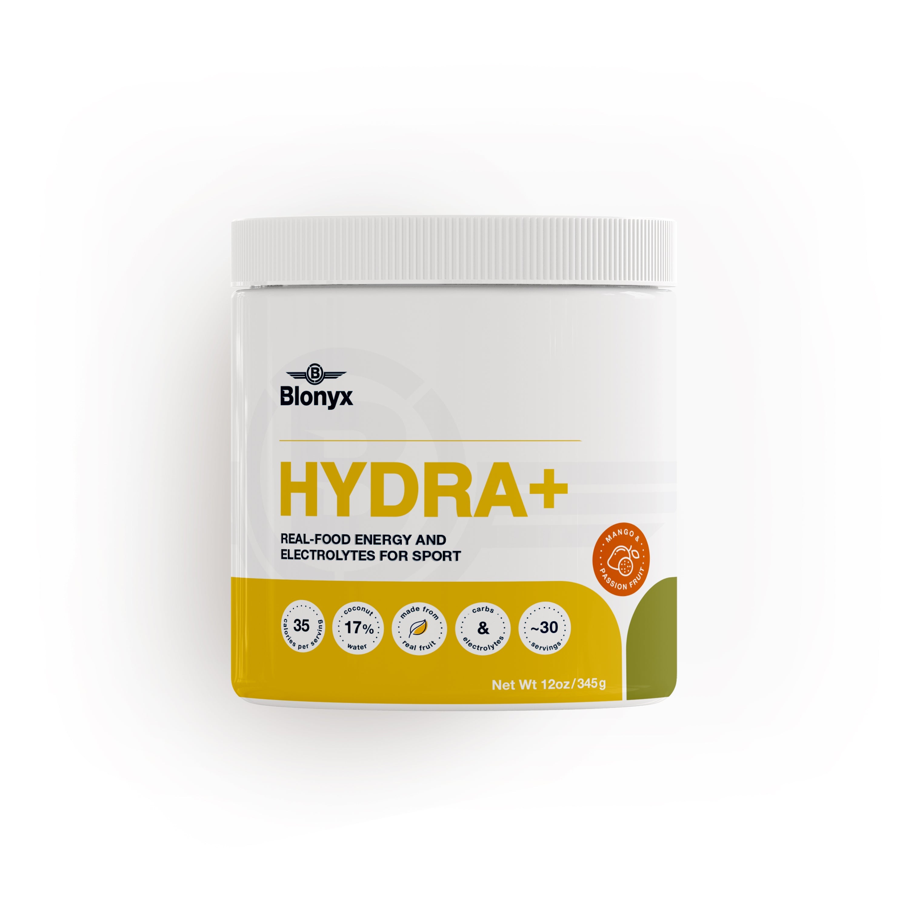 Hydra+ contains carbs and electrolytes from real food sources like coconut water, fruit juices and a pinch of sea salt (and it tastes just like it sounds). It contains less sodium than other sports drinks as science shows that blood sodium levels go up, not down when you dehydrate.